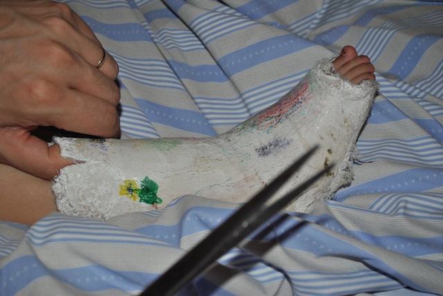 Ioana cu piciorul in ghips Share Written By Mihaela Zaharia Tags 2011-06-09 Dumincă, acum două săptămâni eram cu copiii la un loc de joacă dintre blocuri. Ioana se jucase de o oră urcând pe un topogan şi dându-se jos pe o bară de lângă el ca maimuţa, când i-a venit ideea să sară ca să îi arate unei fetiţe ce poate face ea. Şi a sărit! Şi a rămas jos. Abia atunci am văzut-o şi eu, deşi eram pe banca de lângă. A început să plângă spunând că o doare laba piciorului. Am luat-o în braţe şi am plecat acasă. Acasă a mâncat şi s-a culcat. Când s-a trezit piciorul era puţin vânăt şi puţin umflat. După telefoanele de rigoare la medici am hotărât să nu mergem la spital imediat, să mai aşteptăm până a doua zi să vedem ce se întâmplă. Dar am fost la farmacie şi am dat-o cu gel antiflebitic MK . A doua zi durerile au continuat şi Ioana tot nu punea piciorul în pământ, aşa că după prima lecţie de vioară pe care nu vroiam să o mai ratăm, am plecat la spitalul Budimex / Marie Curie. Am ajuns cu un taxi direc la urgenţe. Pe lângă noi tocmai trecuse o ambulanţă SMURD care era deja acolo cu o mămică şi un copilaş. În rest era liber: La calculator am terminat repede fiindcă Ioana era deja în baza de date din 2008 când am operat-o tot acolo de hernie inghinală. Ne-a trimis la ortopedie. A văzut-o medicul si ne-a trimis la radiografie la aparatul de aici, unde am stat şi eu să o ţin de picior în poziţia necesară (*pozele cu spitalul sunt luate de pe net, nu am avut eu timp si dispozitie atunci să mai fac şi poze): Înaintea noastră mai era un băieţel cu mâna ruptă şi după noi, încă o fetiţă şi un băieţel. Spre surprinderea mea, radiografia a fost trimisă prin internet sau reţea direct în calculatorul medicului ortoped. După ce a văzut-o, concluzia a fost că piciorul nu e rupt, nu e fisurat, dar fiindcă ea nu îl punea jos de durere, probabil e o întindere, aşa că tot va fi pus în ghips pentru 2 săptămâni. Când a întrebat-o pe Ioana dacă vrea, ea a spus: Da! – probabil i se părea tare interesantă chestia asta cu ghipsul. Aşa că ne-am dus în partea celalaltă a intrării principale şi i s-a pus piciorul în ghips. A stat liniştită până i l-a fixat la sfârşit când a plâns fiindcă o durea. Dar i-a trecut când a aflat că are dreptul să îşi aleagă orice jucărie vrea de la chioşcul cu jucării din curte. Şi-a ales un telefon şi am plecat acasă. Acasă, ghipsul a fost imediat colorat. A doua zi nu s-a dus la grădiniţă, dar a treia zi s-au dus, bineînţeles cu acordul educatoarelor care trebuiau să o care pe scări în braţe, cel puţin o perioadă. Am fost şi eu cu ea şi am stat un timp până s-a acomodat şi până … au epuizat colegii întrebările şi s-au obişnuit cu ea în noua postură. Aşa că următoarele zile, Ioana a mers şontâc, dar s-a descurcat. Aşa a participat la prima ei auditie de pian: Asa a exersat la vioara: Aşa s-a distrat cu Bombonica la petrecerea de după serbarea lui Robert: Şi s-a dat chiar şi în leagăn: Iar cu două zile înainte de a se împlini 2 săptămâni, tati i-a scos ghipsul acasă: Ca la serbarea de sfârşit de an de a doua zi, să fie “purceluş” pe ambele picioare: Culmea e că atunci când am ajuns la Palatul Copiilor, arătând tuturor că ea nu mai are ghips, am aflat că prietena ei, care îşi serbase aniversarea cu o zi în urmă, avea piciorul în ghips până deasupra genunchiului, de data asta fiind chiar rupt. Aşa că a fost rândul ei să facă serbarea stând pe scăunel. Uff!
